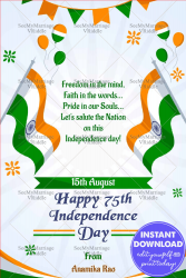 Below the quote, add a bold ribbon banner with the date: “15th August”, and large celebratory text: “Happy 75th Independence Day” in elegant blue calligraphy font. Include space at the bottom for a personalized signature (e.g., “From Anamika Rao”). Use a bright and energetic background with radial gradients or light rays to enhance the celebration mood.