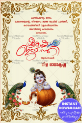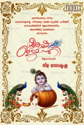 This vibrant Malayalam Sree Krishna Janmashtami greeting card beautifully captures the divine innocence of Baby Krishna. Adorned with a peacock feather crown, jewelry, and a radiant smile, Krishna is depicted joyfully reaching into a traditional clay butter pot, symbolizing abundance and playfulness. On either side, majestic peacocks with lush feathers and blooming red flowers enhance the festive charm. The ornate golden floral border frames the cream backdrop, giving it a rich traditional appeal. Malayalam calligraphy in bold red conveys heartfelt wishes, making it perfect for celebrating the auspicious occasion with warmth and devotion.