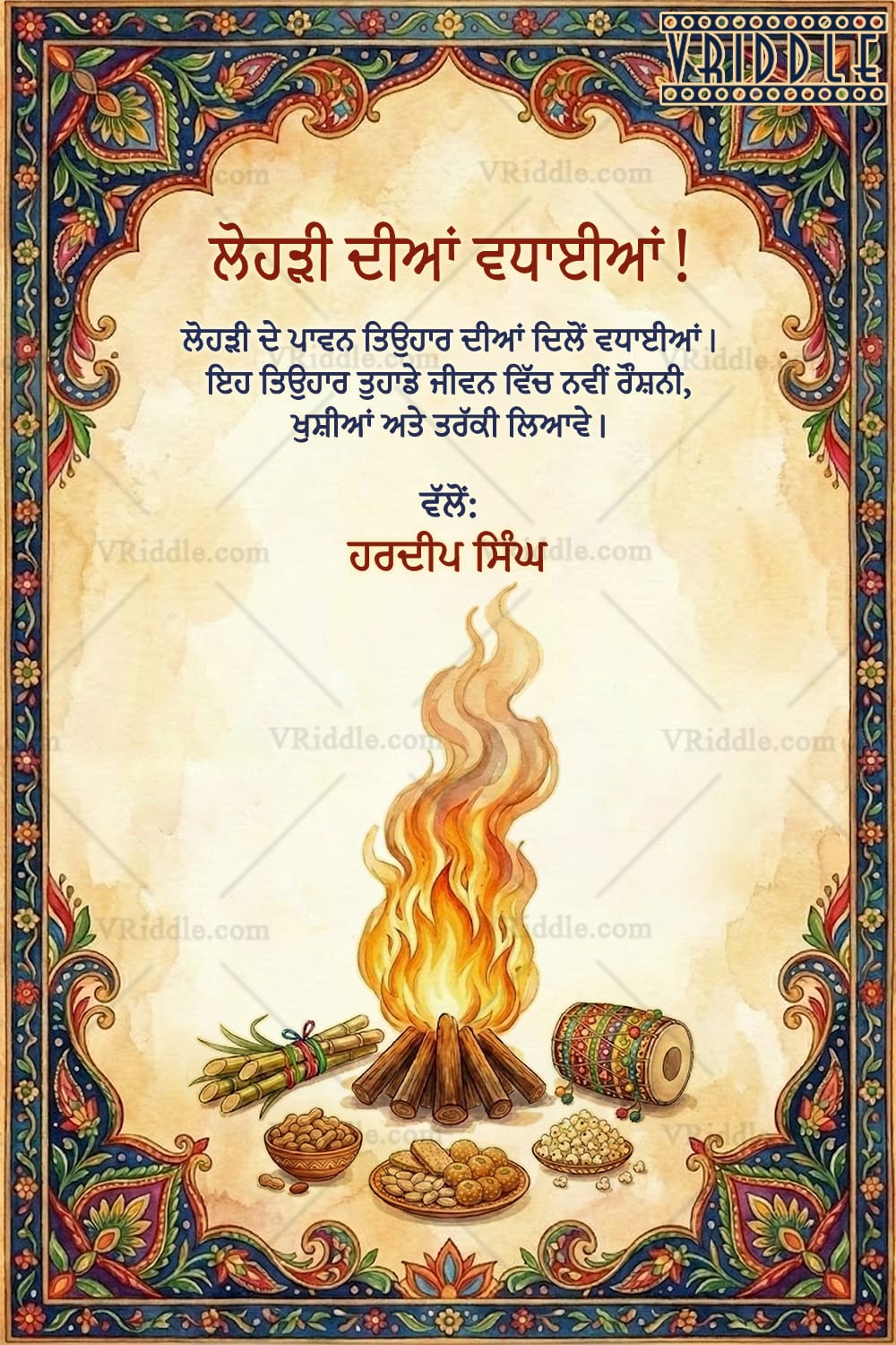 This elegant Lohri invitation card is inspired by traditional Punjabi folk art and timeless festival aesthetics. The design features a softly textured parchment-style background framed with a richly detailed hand-painted floral border in vibrant folk colors. At the center, a glowing watercolor bonfire symbolizes warmth, gratitude, and new beginnings, surrounded by iconic Lohri elements such as sugarcane stalks, peanuts, popcorn, revri, laddoos, and a decorative dhol.