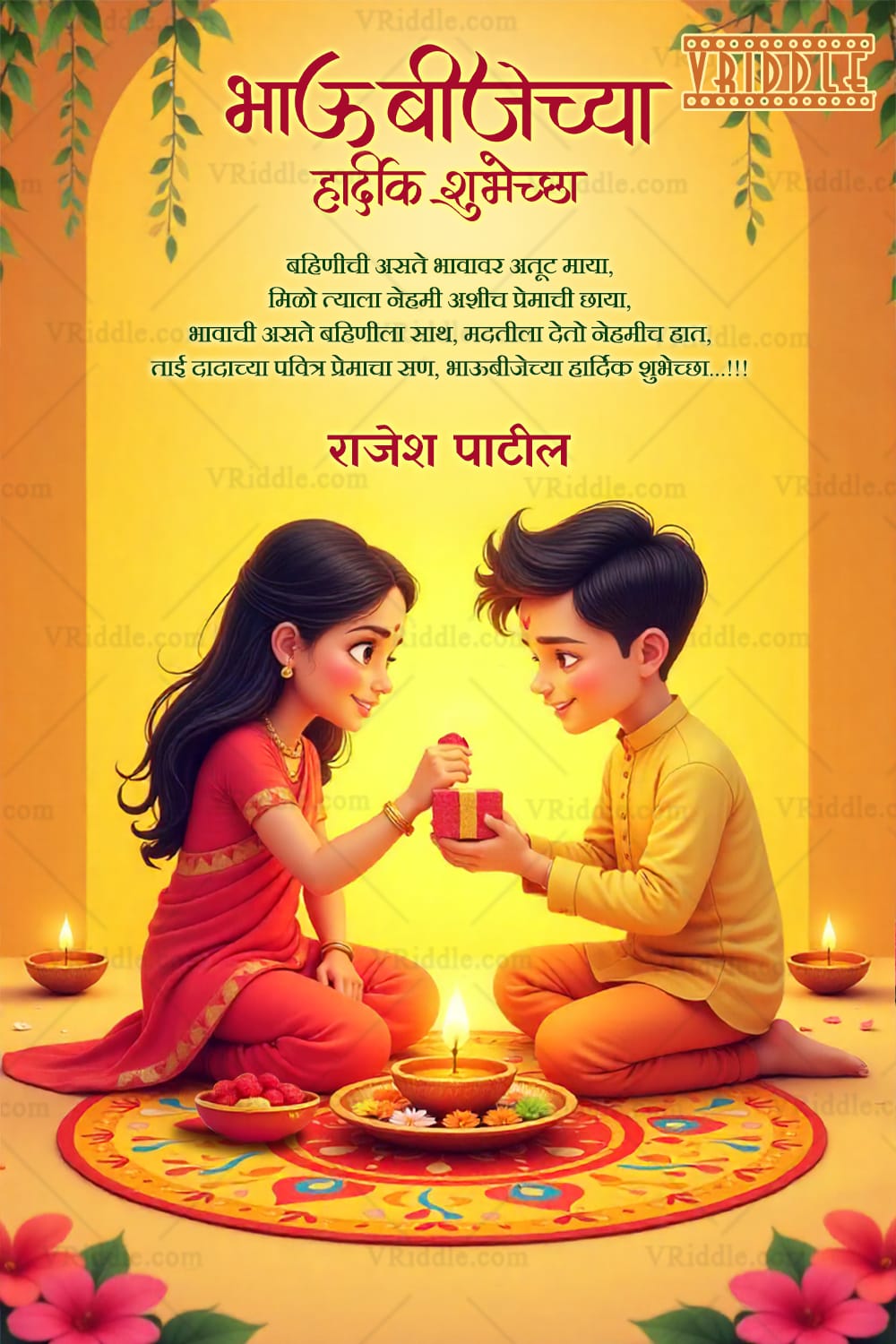 This image is a beautifully illustrated Bhau Beej (भाऊबीज) greeting card in Marathi, capturing the heartfelt bond between a brother and sister. The background is bathed in warm yellow and orange tones, creating a cozy festive atmosphere filled with love and light. At the center, a young sister is seen applying a ceremonial tilak on her brother’s forehead while he offers her a gift — a traditional ritual that symbolizes protection, affection, and the unbreakable bond between siblings.