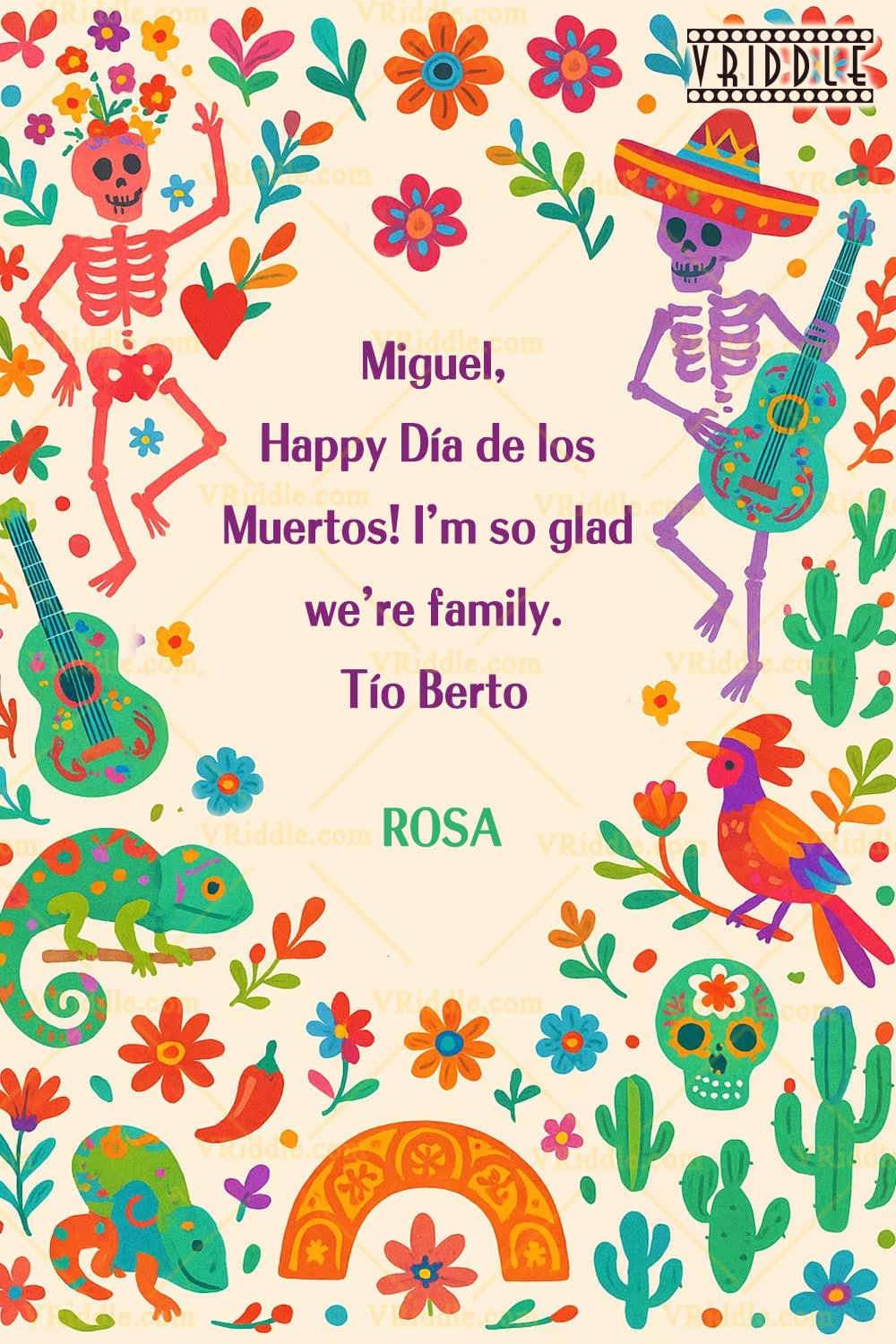 This joyful Día de los Muertos card bursts with life and color, featuring dancing skeletons in traditional Mexican attire—one strumming a guitar in a sombrero, the other mid-leap with festive flair. Surrounding them are playful elements like birds, a rabbit, a chameleon, and vibrant flowers, hearts, stars, and rainbows that add whimsy and warmth. The light beige background enhances the cheerful palette, while the heartfelt message from Tío Berto and Rosa to Miguel celebrates family and remembrance in a lively, uplifting way.