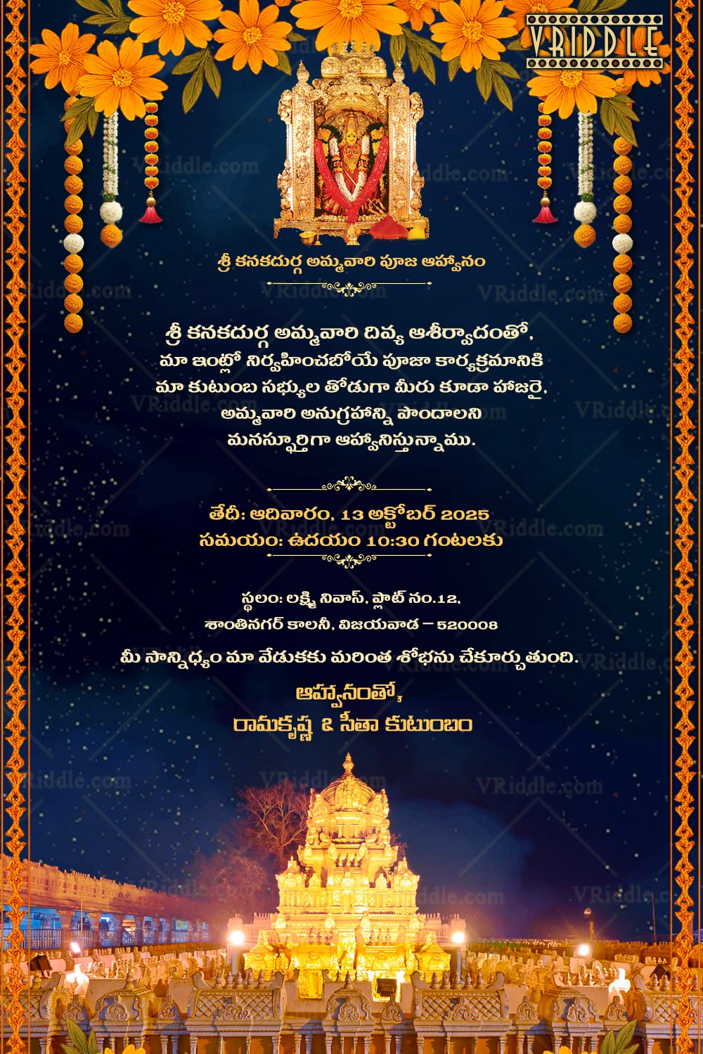 This sacred invitation radiates spiritual grandeur, featuring the magnificent Kanaka Durga idol adorned in shimmering gold at the center of the design. The deep midnight blue sky glitters with countless stars, creating a heavenly backdrop for the golden temple that glows in all its divine splendor. Bright yellow marigold flowers and traditional hanging garlands frame the card, adding a festive touch of devotion and celebration. The intricate borders and warm lighting beautifully capture the essence of this auspicious pooja, inviting loved ones to share blessings and prayers in an atmosphere of celestial grace.