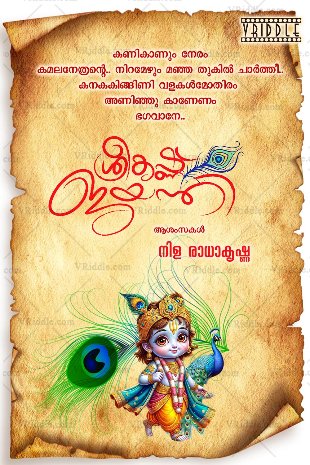 This beautiful Janmashtami greeting card radiates devotion and festive charm, featuring an adorable Baby Krishna adorned with a jeweled crown, peacock feather, and traditional attire. He stands gracefully against a vibrant peacock illustration, symbolizing beauty and divinity. The backdrop resembles an ancient parchment scroll, giving the design a timeless spiritual essence. Elegant Malayalam calligraphy in red conveys the festive message, while delicate decorative swirls enhance the visual appeal. Perfect for sending warm wishes during Sree Krishna Janmashtami, this card blends cultural richness with divine blessings.