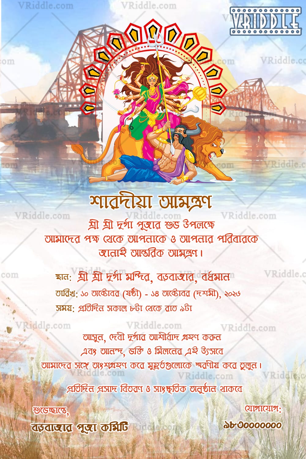 The image is a vibrant and festive Sharodiya (Durga Puja) invitation card in Bengali, celebrating the auspicious occasion of Durga Puja. At the top center, it features a powerful and divine illustration of Goddess Durga slaying the demon Mahishasura, seated majestically on a lion with her ten arms holding various weapons, symbolizing strength and protection. The main heading reads “Sharodiya Amantran” (Durga Puja Invitation) in bold red Bengali script. The body of the card warmly invites recipients and their families to join the Durga Puja celebrations organized by the Burabazar Puja Committee.