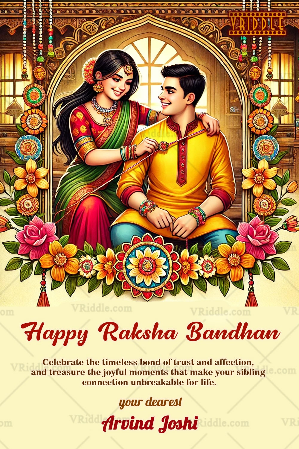 This heartwarming Raksha Bandhan greeting card captures the precious sibling bond through a vibrant and colorful illustration of a sister lovingly tying a rakhi on her brother’s wrist. Set against an ornate wooden arch with traditional Indian motifs and strings of rakhis, the card is richly adorned with marigolds, lotuses, and festive floral arrangements. The warm tones, expressive faces, and joyful atmosphere bring alive the emotional spirit of Rakhi, making it a perfect keepsake for the occasion. A heartfelt message at the bottom adds a personal touch to this festive greeting.