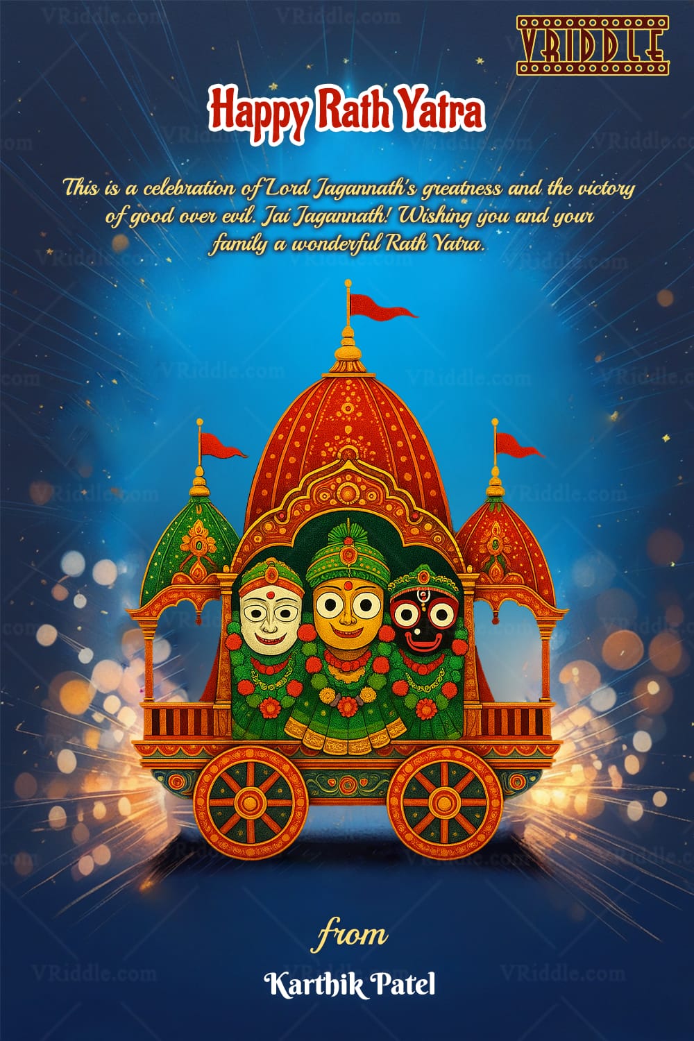 This image is a vibrant and celebratory Rath Yatra greeting card featuring a beautifully illustrated depiction of the divine chariot carrying the three sacred deities — Lord Balabhadra, Goddess Subhadra, and Lord Jagannath — all adorned in green attire and floral garlands. The intricately designed chariot stands out with its rich red, orange, and gold detailing, set against a glowing blue background filled with light rays and festive sparkles, symbolizing the divine energy and joyous atmosphere of the festival.