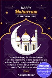 A dark purple-themed Muharram greeting card featuring a central white and gold mosque framed within a stylized golden arch. A large white crescent moon surrounds the mosque, with star decorations hanging down from the top of the card in golden threads.