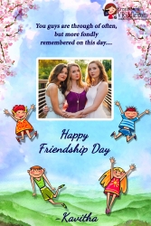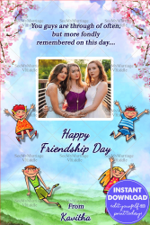 a cheerful Friendship Day greeting card with a bright and uplifting watercolor background featuring a soft blue sky, hints of pink and purple clouds, and grassy green hills at the bottom. Add cherry blossom branches with pink flowers extending inward from the top corners. In the center, include a photo frame with white borders, containing a photo of three friends smiling or embracing. Around the photo and near the bottom, place playful cartoon children in colorful clothes—some jumping, some smiling, to reflect joy and celebration.