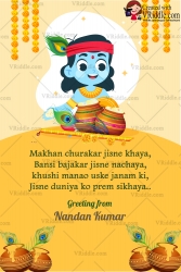 a cheerful and vibrant Krishna Janmashtami greeting card for kids. Use a warm yellow and peach-toned background with hanging marigold garlands at the top. Feature a cute cartoon-style baby Krishna with a peacock feather crown, red headband, and butter pots (matkis) overflowing with makhan. Place a flute and peacock feathers near the pots as cultural elements. Add a playful, rhyming Hindi verse in stylish Devanagari or Latin script, celebrating Lord Krishna’s birth. At the bottom, include a space for a personalized greeting such as “Greeting from [Name]” in decorative fonts. The design should be joyful, colorful, and festive—perfect for Janmashtami celebrations.