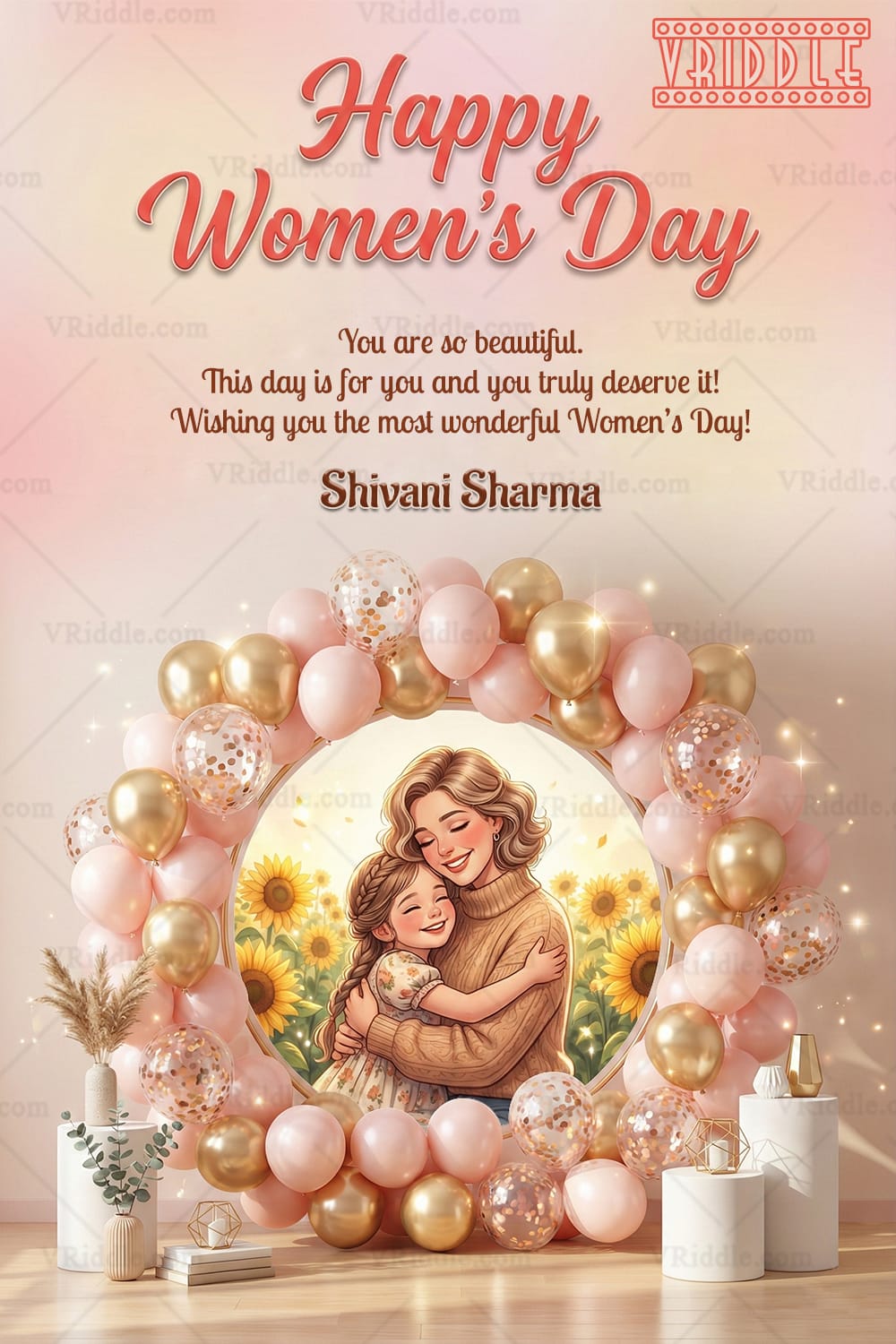 This heartwarming Women’s Day card celebrates love, strength, and tenderness through a beautiful mother–daughter illustration placed inside a luxurious circular balloon arch. The design features soft pastel shades of blush pink, peach, and gold, complemented by glossy balloons and subtle sparkles for a festive yet elegant feel. Sunflowers in the background symbolize warmth and positivity, while minimal décor elements and gentle lighting enhance the emotional charm of the card.