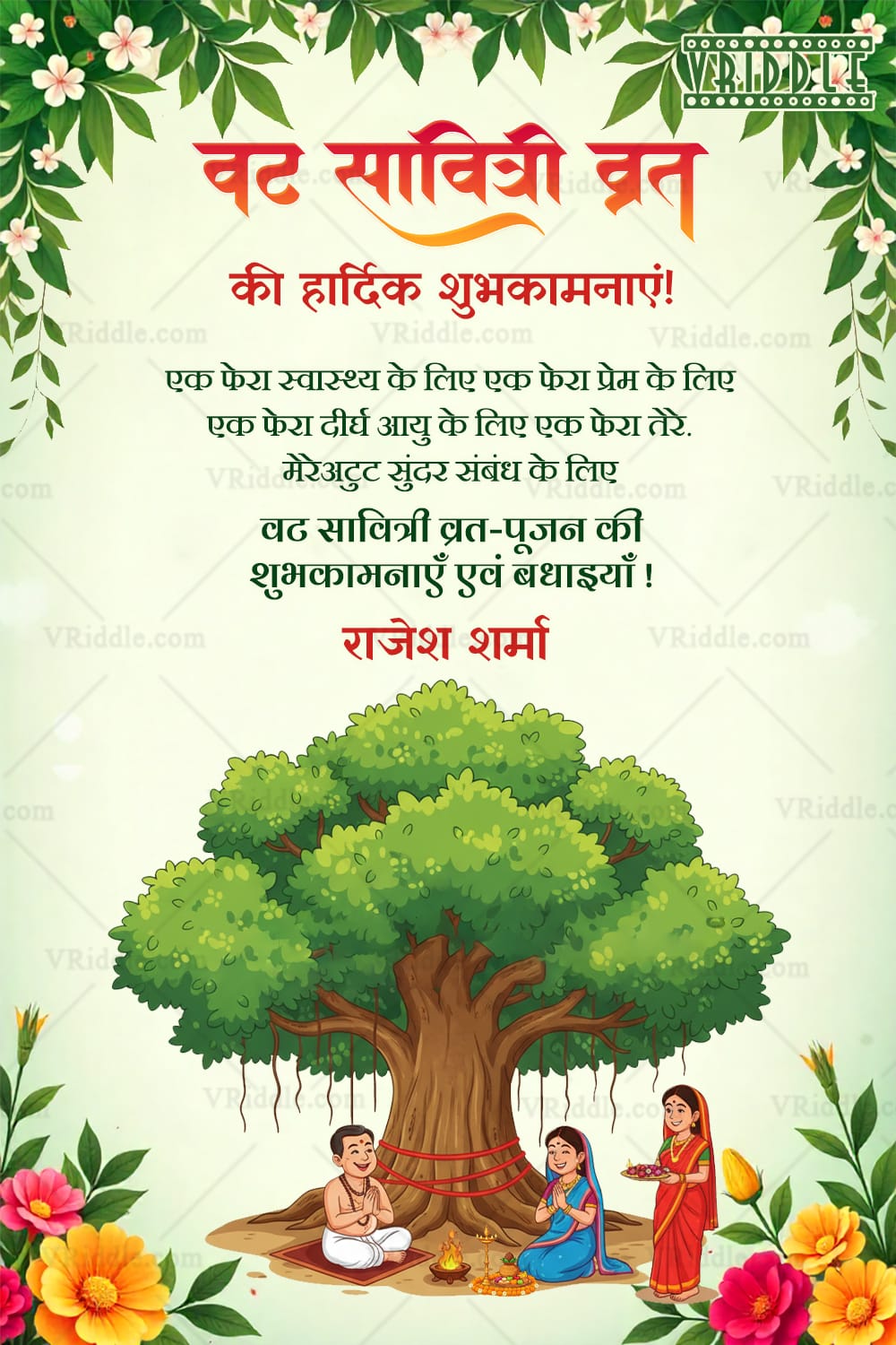This image is a bright and culturally meaningful Vat Savitri Vrat greeting card, designed to convey festive wishes for this sacred Hindu observance. The card features a lush banyan tree (Vat Vriksha) in the center, symbolizing longevity and strength, under which a traditional puja scene is illustrated. A married couple is shown performing the ritual, with the woman tying red sacred threads around the tree, while seated in prayer alongside her husband and another woman standing with a decorated puja thali.