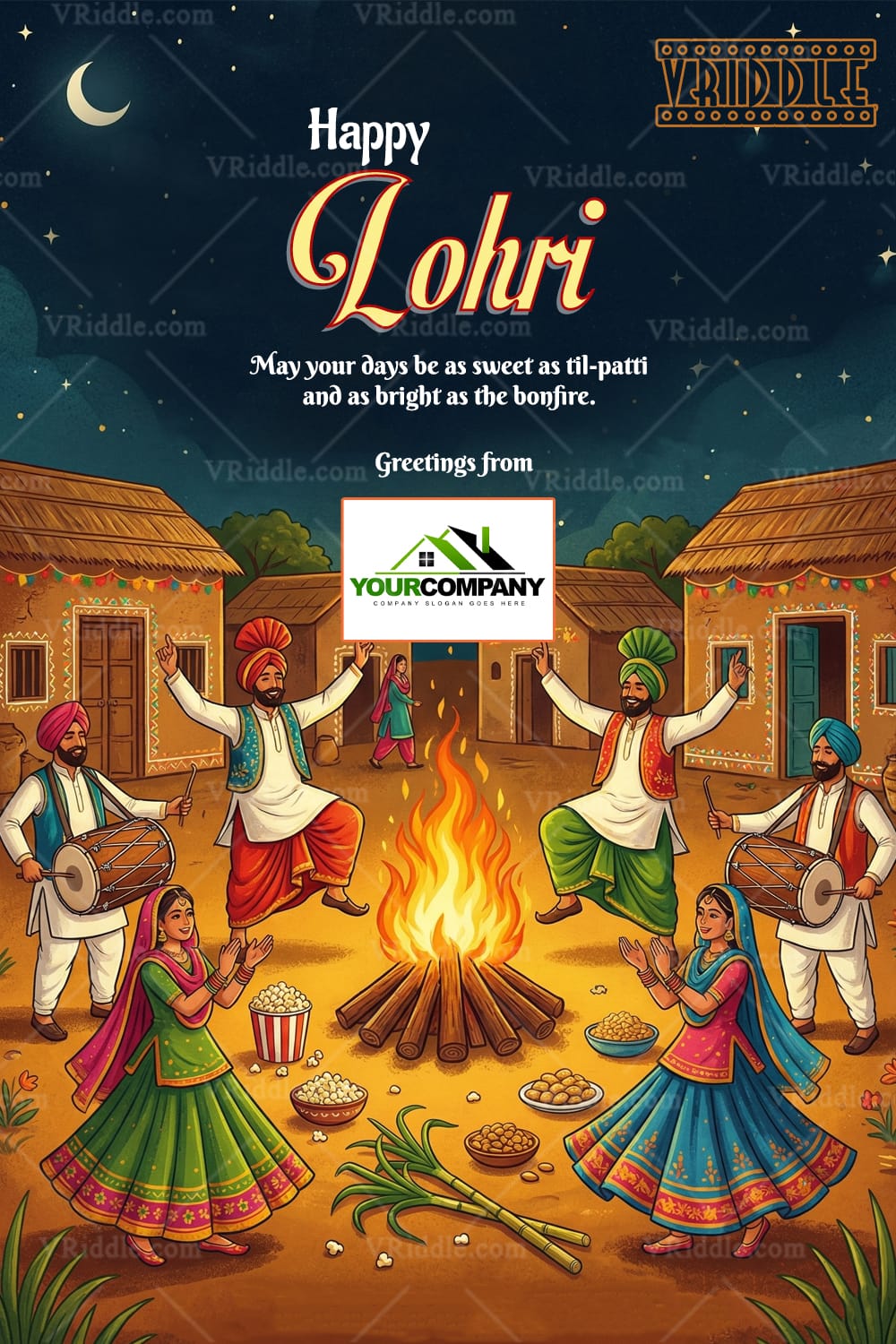 This lively Lohri greeting card beautifully captures the warmth and energy of a traditional Punjabi celebration. At the center, a glowing bonfire symbolizes prosperity and togetherness, surrounded by men and women joyfully performing bhangra and giddha to the rhythm of dhols. The rustic village huts, colorful attire, sugarcane stalks, popcorn, peanuts, and til-patti reflect authentic festive elements, while the deep blue night sky with stars and a crescent moon adds a magical, celebratory mood.