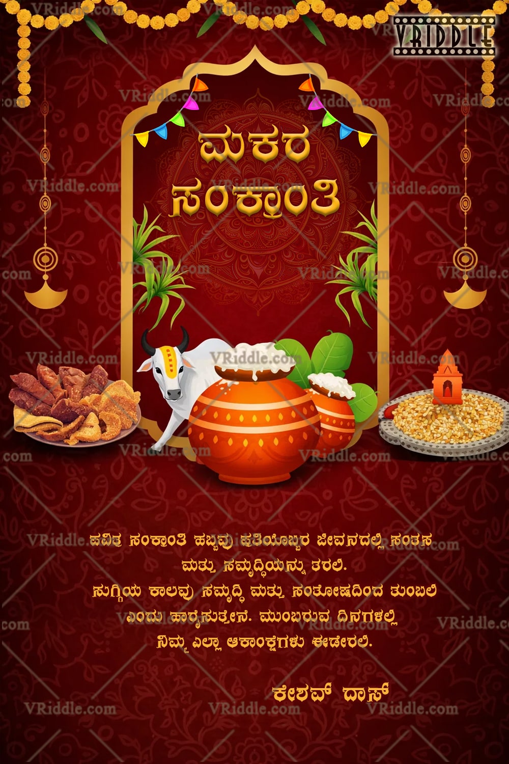 This traditional Kannada Makara Sankranti greeting card is designed in a rich maroon-red palette that reflects warmth, devotion, and festive prosperity. The centerpiece features elegant Kannada typography set within a golden ornamental arch, creating a temple-inspired frame. Festive elements such as overflowing pongal pots, sacred green leaves, sugarcane, and a graceful cow symbolize abundance, harvest blessings, and rural tradition. Decorative hanging lamps, floral garlands, and colorful buntings add a joyful celebratory touch, while the patterned background enhances the cultural depth. Overall, the design beautifully blends tradition, language, and symbolism, making it perfect for heartfelt Sankranti wishes in Kannada.