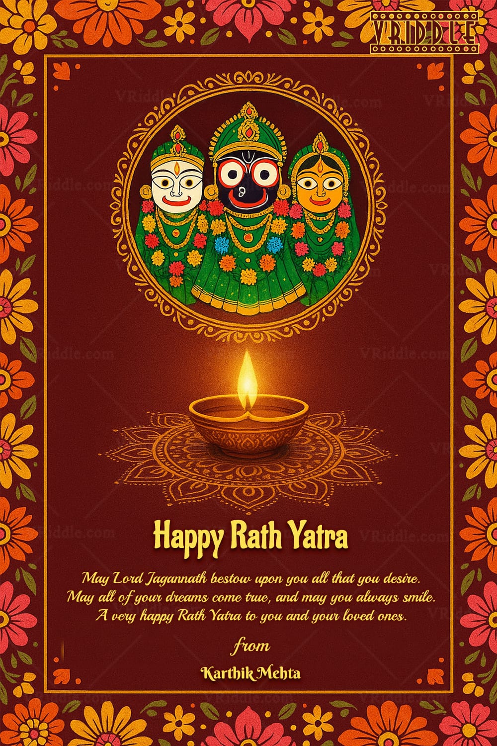 This image is a beautifully crafted Rath Yatra greeting card that blends vibrant traditional Indian aesthetics with a heartfelt message. At the center is a circular framed illustration of the divine trio — Lord Balabhadra, Lord Jagannath, and Goddess Subhadra — adorned in rich green attire and decorated with floral garlands, exuding devotion and festivity. Below the deities is a traditional lit oil lamp (diya) placed on a delicately patterned rangoli, symbolizing light, purity, and celebration.