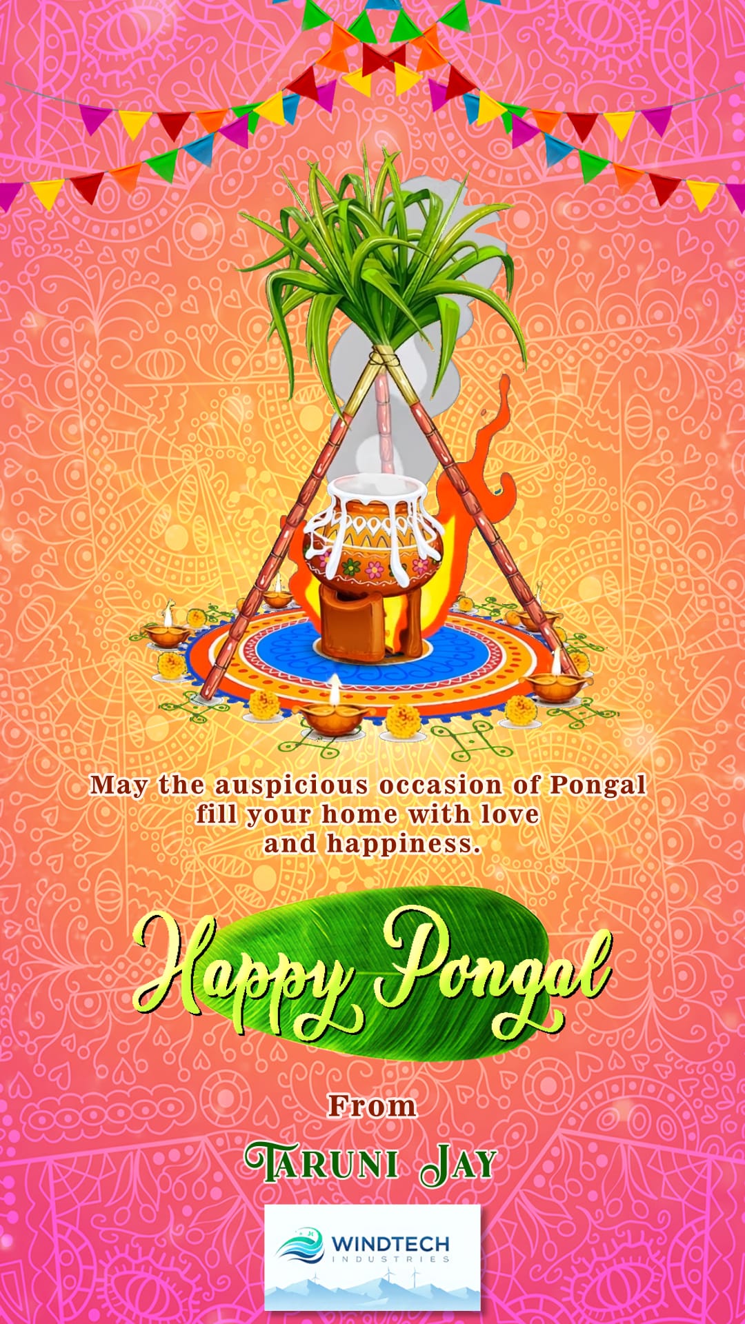 This lively Pongal greeting card beautifully captures the spirit of the harvest festival with a central illustration of the auspicious Pongal pot overflowing with milk, symbolizing abundance and prosperity. The pot is placed over a sacred fire, supported by sugarcane stalks tied together, representing agricultural gratitude. Surrounding rangoli designs, glowing diyas, and marigold accents enhance the traditional charm, while colorful triangular buntings add a playful festive touch.
