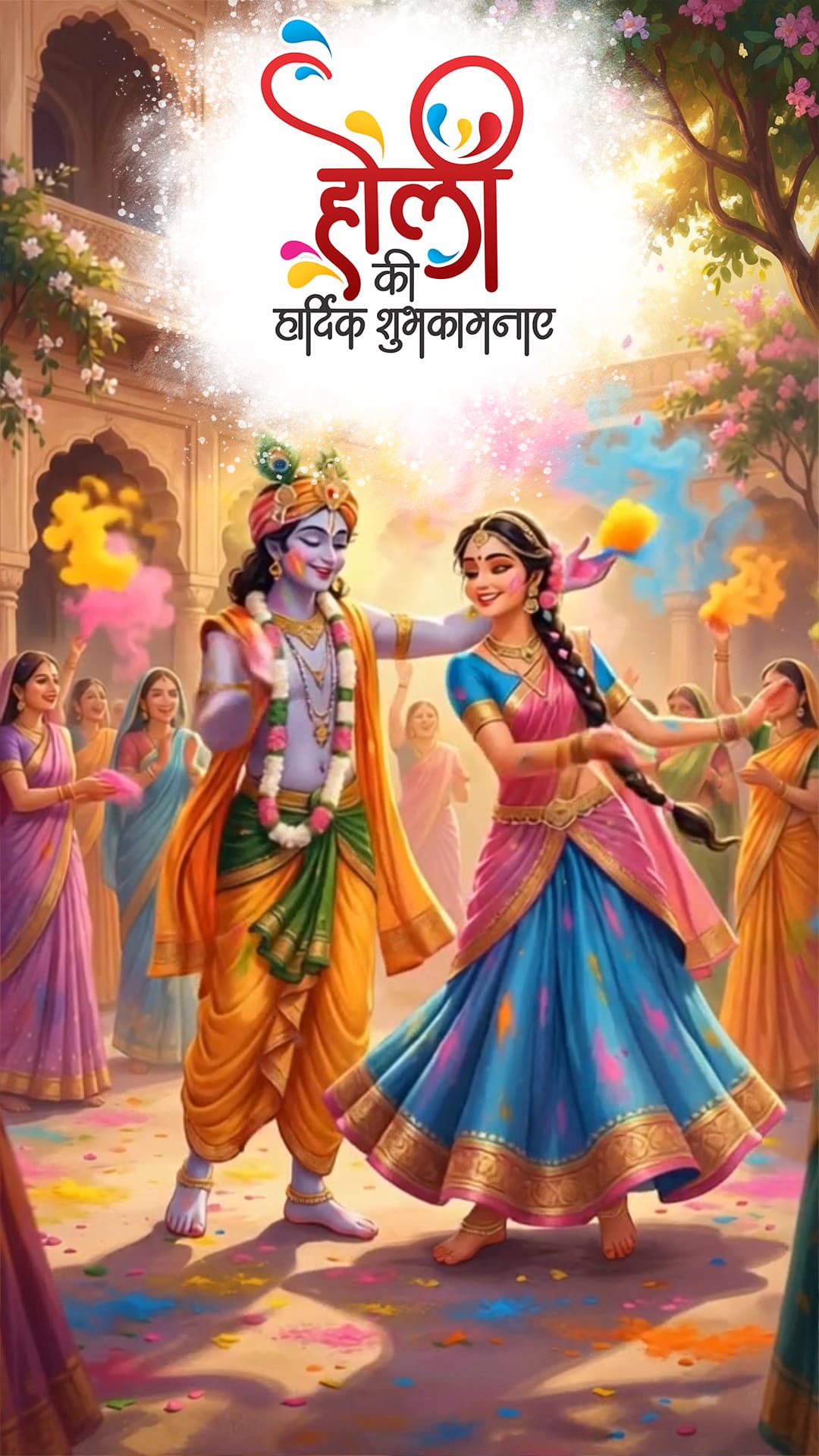 Radha Krishna Holi Celebration Greeting Video with Vibrant Gulal Colors, Traditional Indian Courtyard and Festive Dance Scene