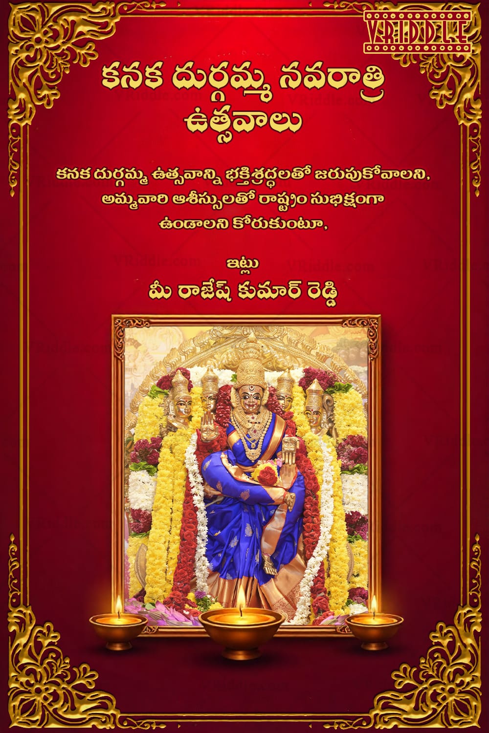This beautifully crafted greeting card celebrates the auspicious occasion of Kanaka Durga Navaratri Utsavalu with divine elegance and traditional richness. Set against a luxurious deep maroon backdrop with ornate golden floral borders, the design captures the spirit of devotion and festivity. The highlight of the card is the exquisite idol of Goddess Kanaka Durga, draped in a royal blue saree and adorned with layers of gold jewelry and vibrant floral garlands. She is seated gracefully amidst divine symbols and flanked by accompanying deities, radiating power and protection. Framing the deity are golden oil lamps (diyas), enhancing the spiritual glow of the image.