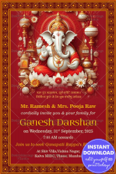 This striking Ganesh Darshan invitation card features a rich red background adorned with intricate gold designs, exuding a sense of royalty and tradition. At the center, a beautifully detailed image of Lord Ganesha, depicted in white and gold, sits gracefully amidst lotus flowers and traditional elements. The ornate border, filled with intricate patterns and golden motifs, frames the card, enhancing its luxurious appeal. The invitation text is presented in a harmonious blend of elegant fonts, inviting guests to partake in the spiritual celebration with Ganapati Bappa’s blessings. This card perfectly captures the grandeur and sanctity of the occasion.