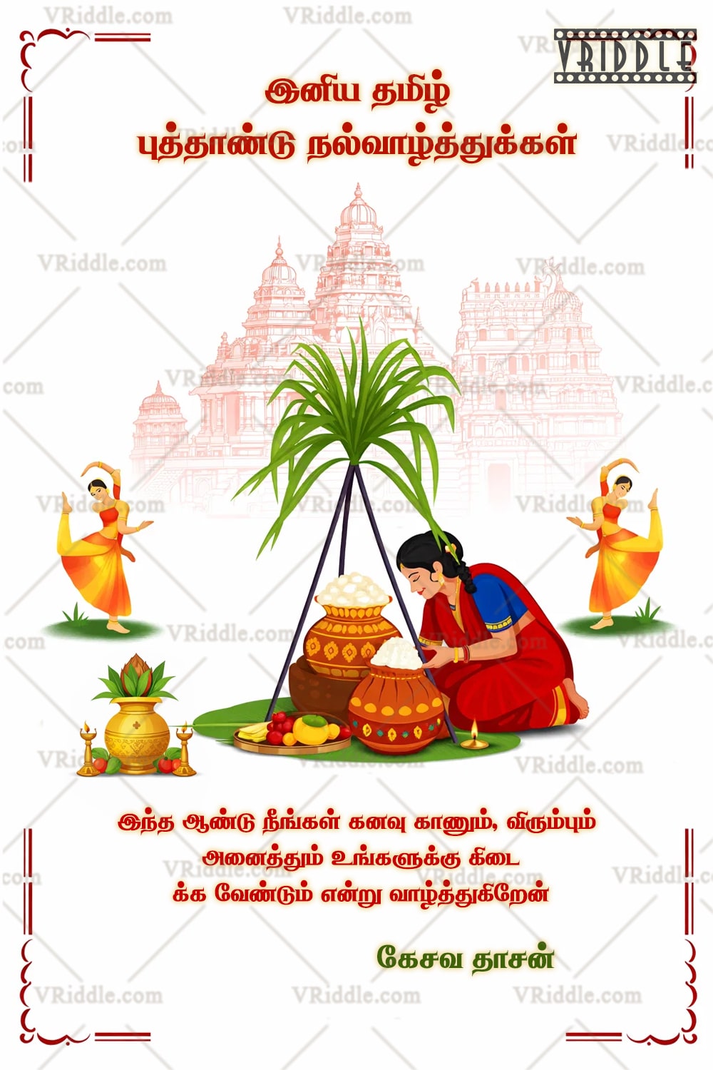This graceful Tamil Puthandu greeting card is designed on a clean white background that highlights simplicity, purity, and fresh beginnings. At the center, a traditional Pongal preparation scene shows a woman in classic Tamil attire carefully cooking pongal beneath sugarcane leaves, symbolizing abundance, gratitude, and prosperity. Subtle temple line art in the background adds cultural depth without overpowering the design, while elegant Bharatanatyam dancers on either side bring movement and festive joy. Auspicious elements like the kalash, oil lamps, fruits, and flowers enhance the traditional New Year spirit. Balanced typography and ample white space give the card a calm, elegant, and celebratory feel, perfect for heartfelt Tamil New Year wishes.