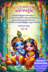 This image is a vibrant and beautifully illustrated Telugu Janmashtami greeting poster that conveys warm wishes for the auspicious celebration of Sri Krishna Janmashtami. The design is filled with color, life, and devotion. At the center bottom of the image, an adorable depiction of baby Krishna and Radha is shown sitting on a swing (jhula) adorned with bright marigold and flower garlands. Krishna, with his iconic blue complexion, flute, peacock feather, and joyful expression, sits beside a charming baby Radha dressed in traditional attire with floral ornaments and elegant jewelry. The lush, forest-like background filled with flowers and greenery creates a magical and divine ambiance.