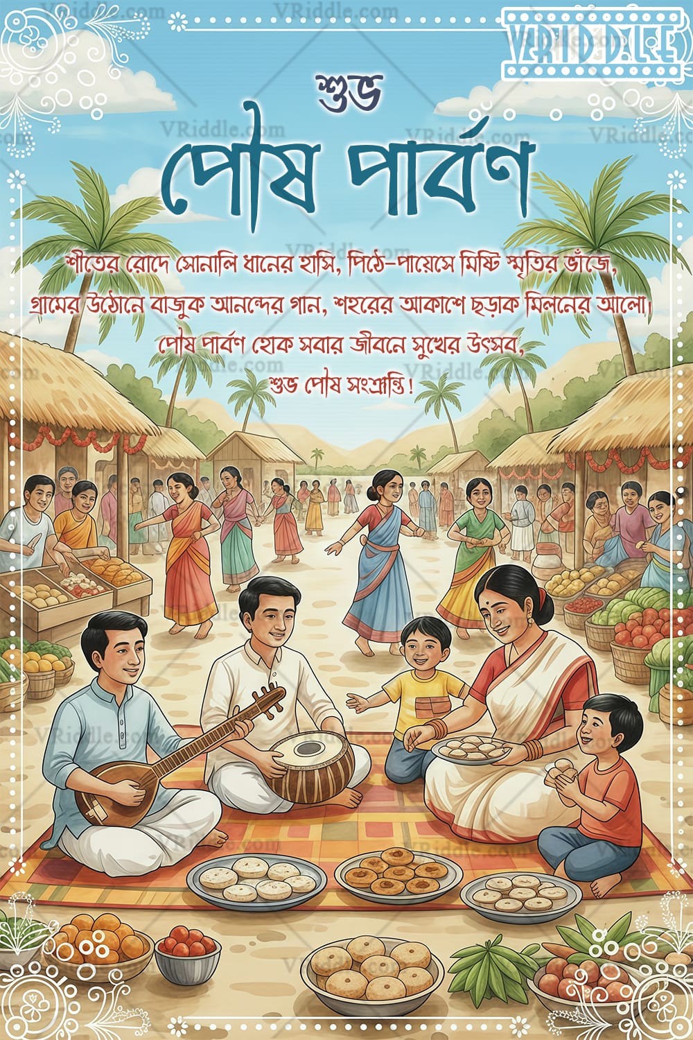 This vibrant illustration beautifully captures the joyful essence of Poush Parbon, a traditional Bengali winter harvest festival. In the foreground, a family sits on a colorful mat, enjoying homemade Bengali delicacies like pithe, puli, and payesh. Musical instruments like the ektara and tabla enhance the festive mood as members of the community sing and play music. In the background, women dressed in colorful sarees dance joyously, children run around, and villagers cheerfully interact at market stalls overflowing with fresh produce.